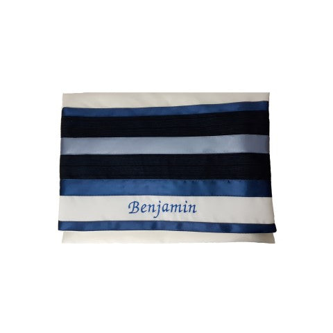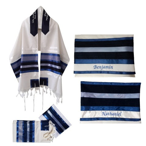 This striking Blue & White Bar Mitzvah Tallit, Men's Tallis, Wedding Tallit is decorated with stripes of varying shades of beautiful Blue Taffeta.