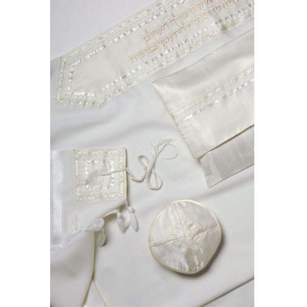 This White on White Tallit is the perfect present from parents or grandparents as a Bar Mitzvah Tallit Set, Wedding Tallit, Hebrew Prayer Shawl.